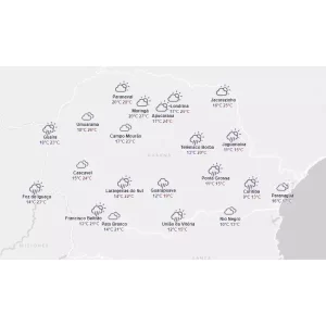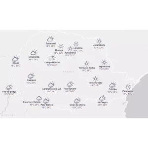 De acordo com o Simepar, há grande probabilidade de chuva na faixa sul do estado. Na metade norte, o dia será ensolarado e as temperaturas estarão elevadas na sexta (11). A frente fria atinge as cidades do oeste e sudeste.