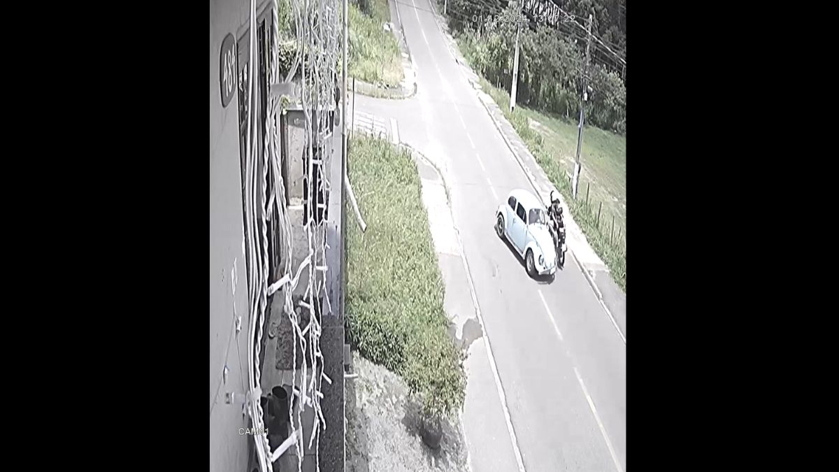 As imagens mostram o motorista sem CNH do Fusca reduzir a velocidade e entrar na pista contrária para fazer uma conversão. Só que na mesma faixa vinha uma moto com dois ocupantes e o veículo acertou a lateral do carro e caiu alguns metros adiante.
