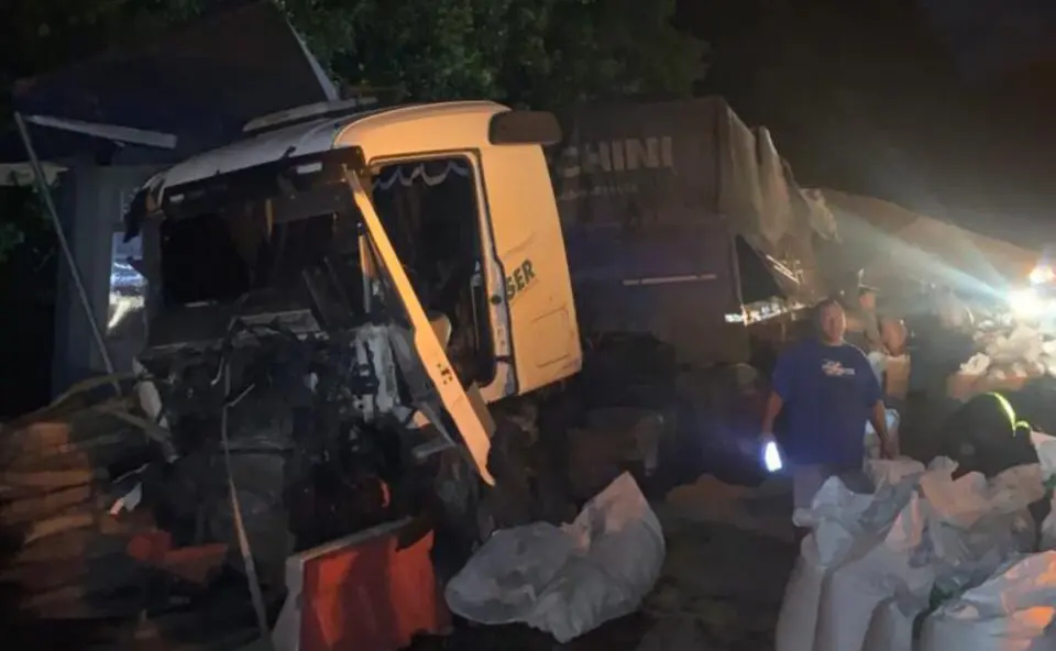 Um caminhão carregado com soja furou o bloqueio feito pela Polícia Rodoviária Federal (PRF) no km 42 da BR-277 e seguiu na pista sentido litoral até colidir contra um guindaste. A rodovia estava interditada devido aos riscos de desmoronamento no local.