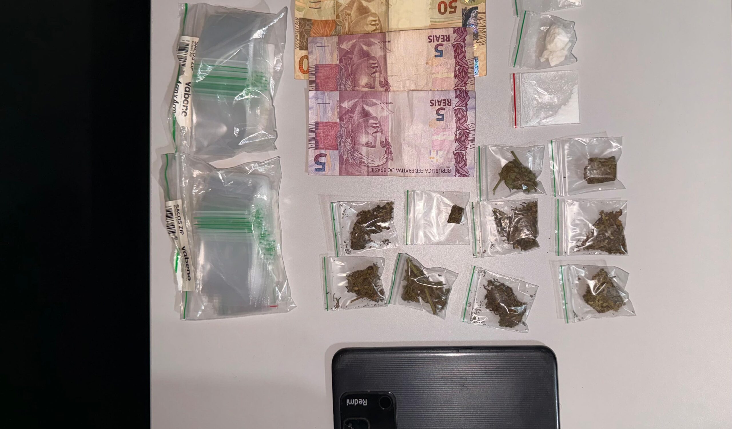 A ação ocorreu durante patrulhamento tático, quando os policiais abordaram um indivíduo em atitude suspeita. Na busca pessoal e averiguação, foram localizadas porções de maconha e cocaína, além de dinheiro em espécie, um aparelho celular e embalagens plásticas do tipo ziplock, comumente utilizadas para o fracionamento e comercialização de entorpecentes.