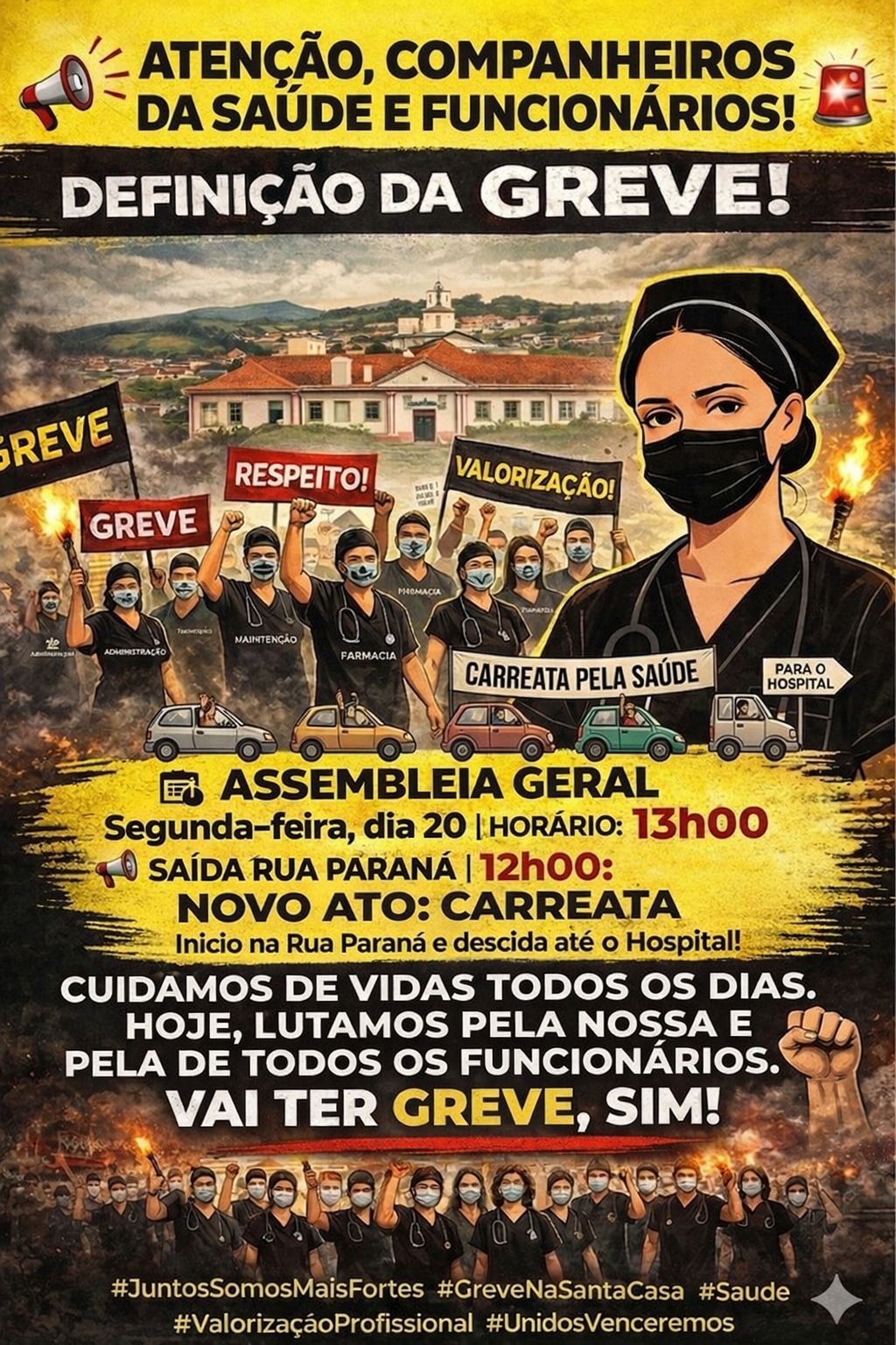 De acordo com a convocação divulgada, uma assembleia geral foi marcada para a próxima segunda-feira, dia 20, às 13h. Antes disso, os participantes devem se concentrar às 12h na Rua Paraná, de onde está prevista a saída de uma carreata em direção ao hospital. O ato foi definido como uma forma de chamar a atenção da população e das autoridades para as demandas da categoria.
