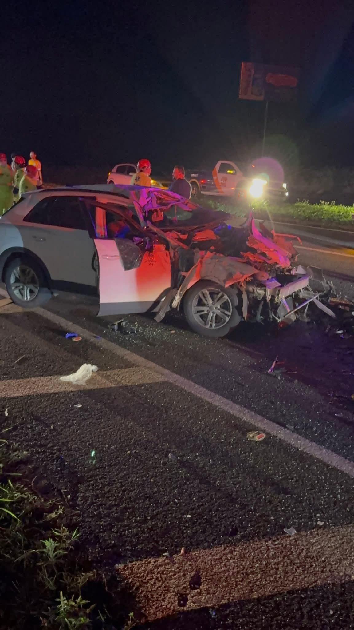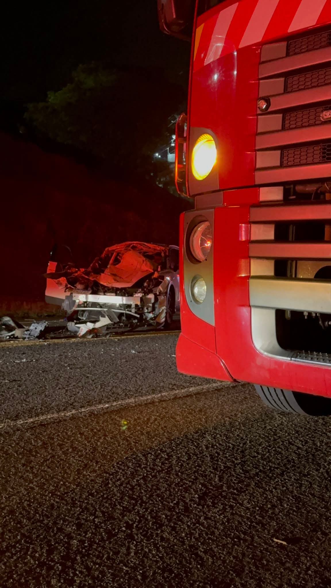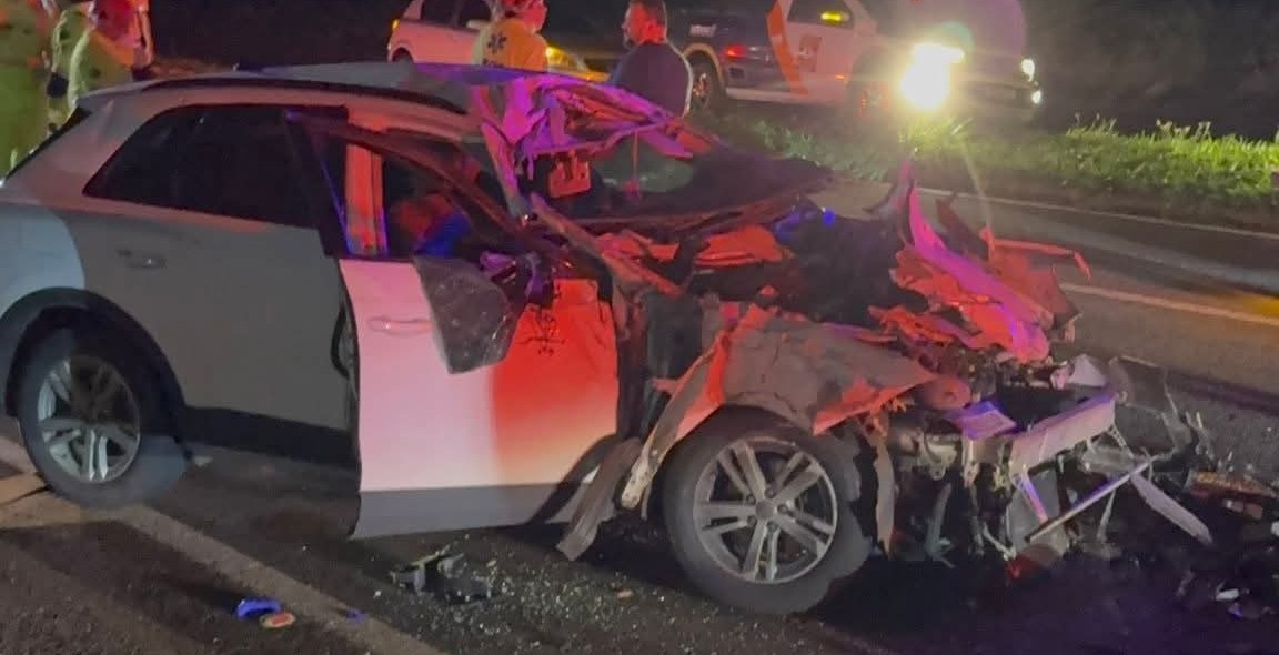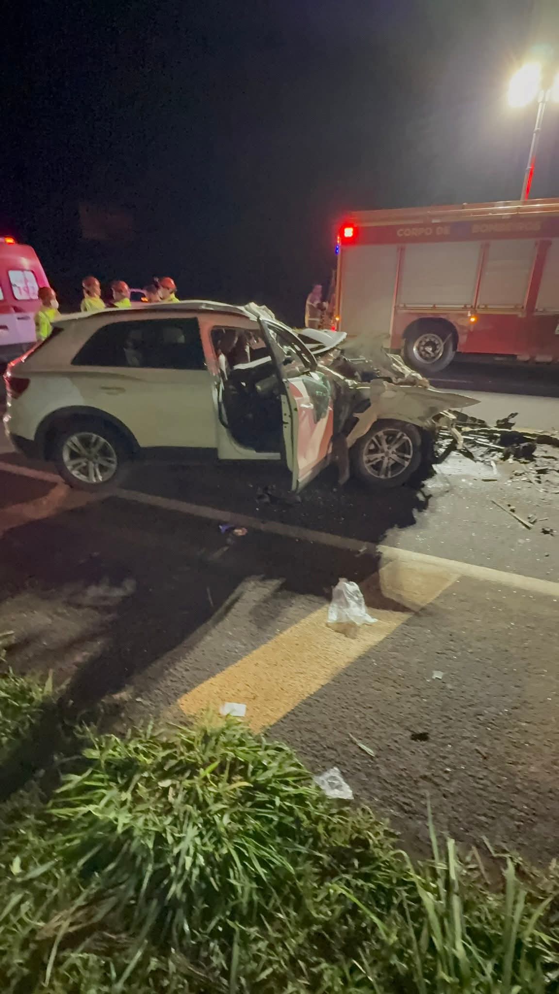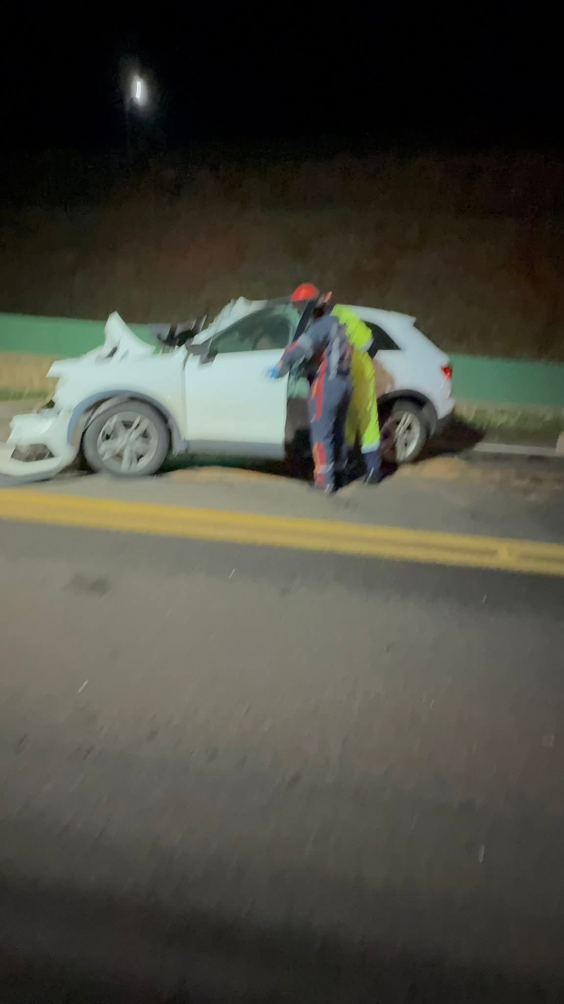 No local, um veículo Audi, de cor branca, com placas de Cornélio Procópio (PR), acabou colidindo violentamente na traseira de um caminhão Mercedes-Benz, de cor amarela e placas Mercosul.
