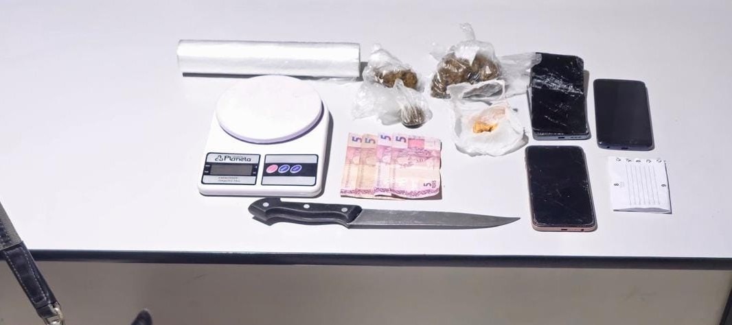 Os dois envolvidos foram presos e encaminhados à Delegacia de Polícia Civil, juntamente com os itens apreendidos, incluindo 3 aparelhos celulares, uma faca, um rolo de saco plástico, R$ 20,00 em espécie e um veículo VW Gol que foi recolhido ao pátio.