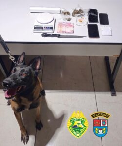 Simultaneamente, a equipe de Operações com Cães abordou a suspeita enquanto ela saía com seu veículo. No momento da chegada da polícia, a mulher tentou quebrar seu celular. Em buscas na residência, realizadas com a utilização dos cães farejadores, foram encontrados 53 gramas de maconha, 7 gramas de crack, dinheiro, balança de precisão e materiais relacionados ao preparo de drogas para venda.