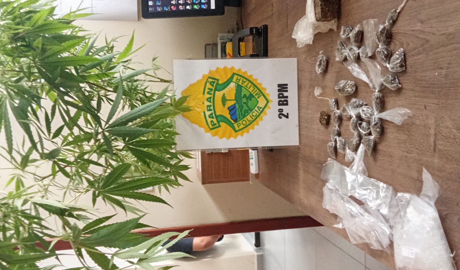 Diante do flagrante, foi realizada a abordagem dos ocupantes do local. Durante as buscas, os policiais localizaram dezenas de porções de maconha já embaladas para venda, uma porção maior da mesma substância e um vaso contendo pés de maconha cultivados na residência.